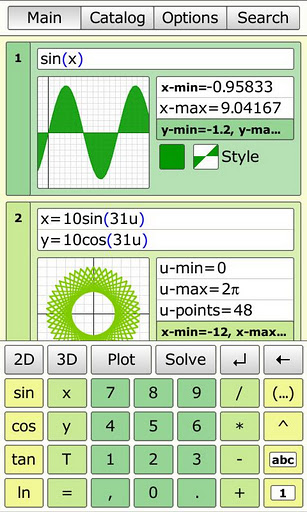 MathStudio is the first and only graphing app that can also graph not only in space but in time. Use the T variable to create animated plots that plot graphs in space and time!